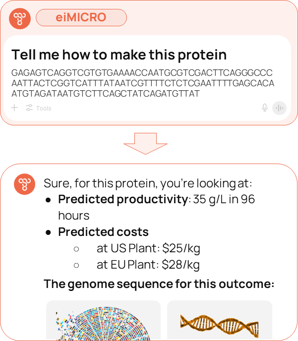 Going from idea to strain to production is too hard, and it costs too much. Imagine if you could design a strain to make your product the same way you ask a question of ChatGPT? We are doing just that with eiMICRO – an in silico organism design SaaS – designed to make years of strain engineering a thing of the past